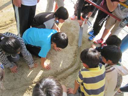5年1組では,流れる水の働きの学習中です。今日は,運動場の砂山の所で実験を行いました。