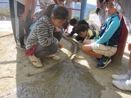 砂山の斜面に作られたスロープを水が流れていく様子を観察していました。