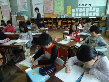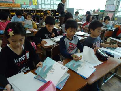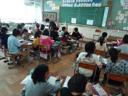 3年2組は『ちいちゃんのかげおくり』です。「場面のうつりかわりをとらえながら読み,感想文を書こう」と黒板には書かれています。
