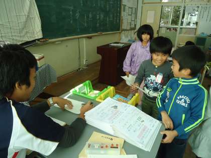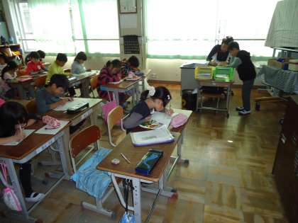 2年1組です。漢字練習をしていました。黒板には「画の長さ」「画と画の間」などと書かれておりいろんな漢字が並んでいます。こどもらはかなり注意深く書いているのが伝わってきます。
