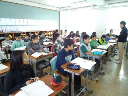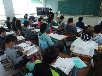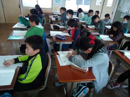 5年1組です。国語の『大造じいさんとガン』の朗読をする際の注意点を聞いているところです。「〜に気を付けて朗読している」と自することが大事なようです。