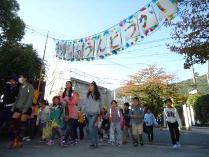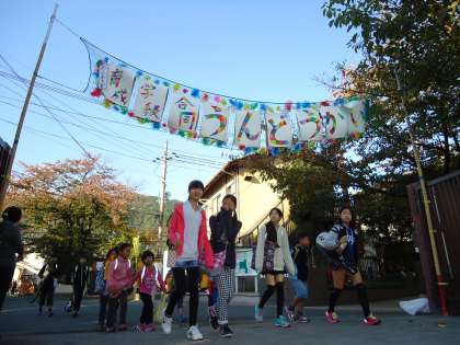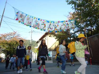 きれいに飾り付けられた合同運動会の横断幕…その下を子ども達が登校してきました。