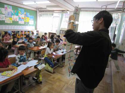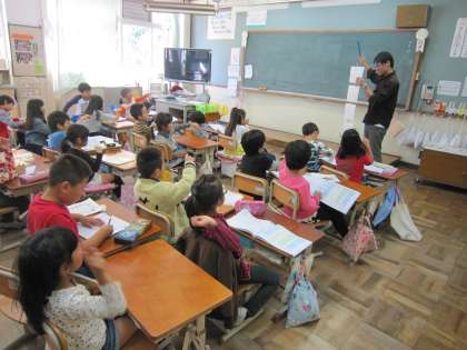 1年2組では,これまでに学習した漢字について,どのような形なのかを確かめていました。みんな元気よく,指示された漢字の形を言っていました。