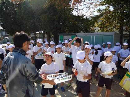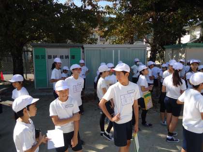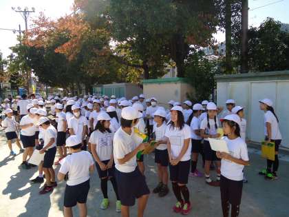 さていよいよ最終の競技『走って歩いてゴーゴゴー』が始まります。5・6年生が一緒になって運動場の端っこで待機しています。