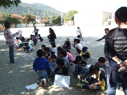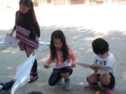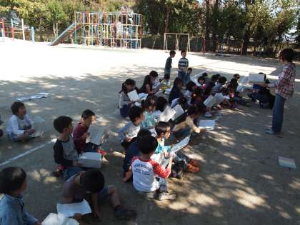 運動場の隅で学芸会の練習をしていたのは1年生。朗読の声がしっかり通るように屋外でやっているのでしょうか。お腹からしっかり声を届けてほしいです。