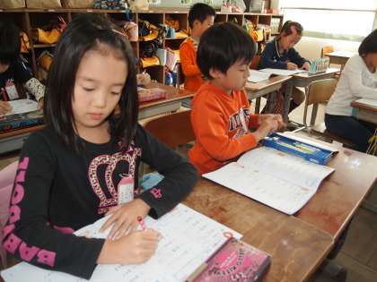 2年2組は算数が始まるところです。ドリルが用意されています…しばらくするととりかえっこをして丸付けを始めたようです。