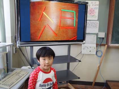 大型テレビに自分の作ったものを映してもらいます。それを見た他の子どもが「これは何の形か」を当てていきました。