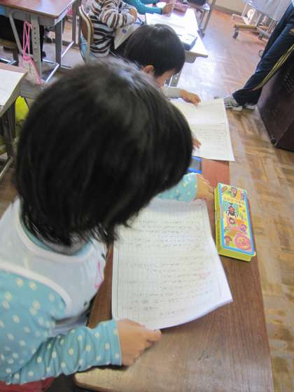 まずは,紹介文を書いた隣の人同士で,紹介文を交換し合い互いの文のいいところみつけをしました。