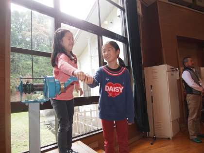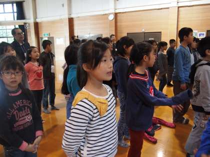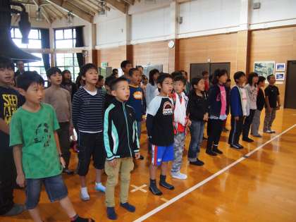 旗揚げ係の児童によって嵐山真東の校旗が揚がります。元気な校歌も響いていました。
