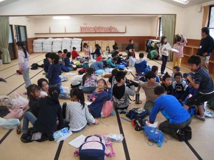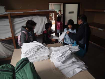 シーツをもらって90畳の部屋に集合します。