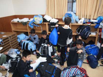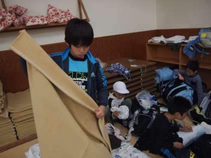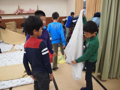 動きは少々スローでも寝具の整理をやっています。感心したのは友達の分まで協力してあげている人がどんどん増えていったこと。素晴らしいと思いました。