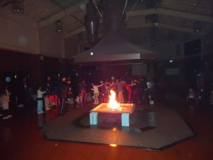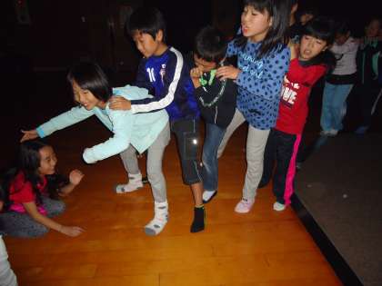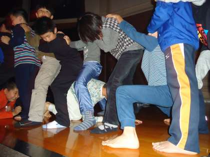「われは大蛇」です。先頭の人がほかの人を飲み込み,飲み込まれた人は全員の股の下をくぐって最後尾にくっついて長くなっていくというゲームです。