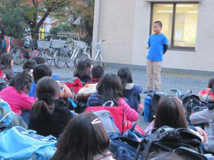 終わりの言葉の児童は,「みなさん,『笑顔で楽しく仲間と団結〜しっかりあいさつテキパキ行動〜』は守れましたか。僕は守れました。これからの学校生活で生かしていきましょう。」と語り掛けました。