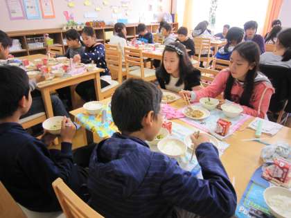 いつもと違う部屋で,いつもと違う食器で食べているので,食も進んでいるように見えました。このランチルームで使う食器は,ペン食器です。PTAの方に購入していただいた食器です。いつもと違う食器でいつも違う部屋で食べる経験もいいものだなと思いました。