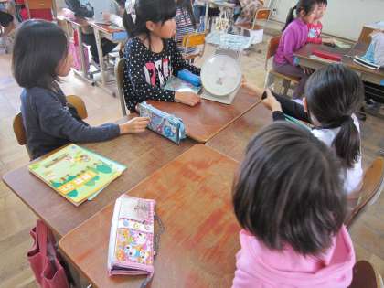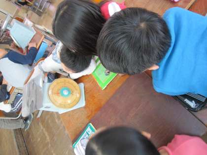 今日は,グループに一台ずつはかりを置いて,1めもりは何グラムですかという問いかけに,はかりの目盛とにらめっこしていました。