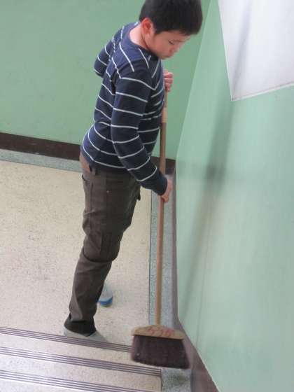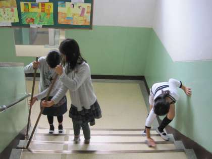 階段をきれいにしようと頑張る子ども達がいました。
