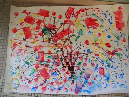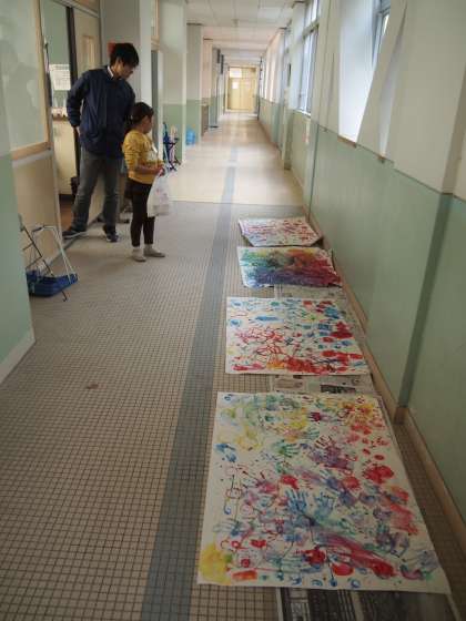 1年2組の「いろいろぺったん」です。いろんなものにえのぐを付けて「ペッタン」「ペッタン」と画用紙にスタンピングします。