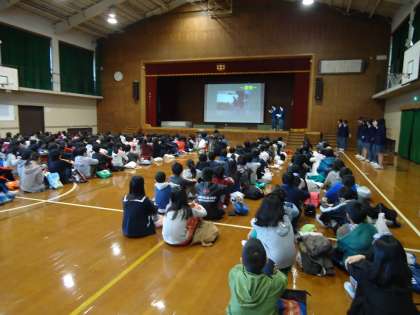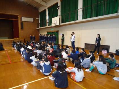 午後から松尾中学校でオープンスクールがありました。これは松尾小学校と本校の6年生を対象に中学校生活を知ってもらうために,松尾中学校の生徒や先生たちがやってくださっているものです。6年生の代表児童が最初の挨拶をしてくれました。その後は「松意中の一日」をビデオで見せてもらいました。