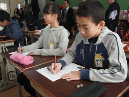子ども達は能と狂言の違いについて知っていることを発表しました。6年生になって狂言『柿山伏』の学習をしているので,そのあたりは何となくわかっているようでもありました。