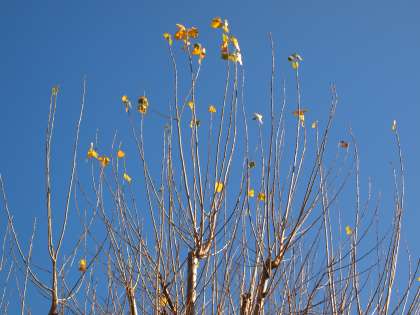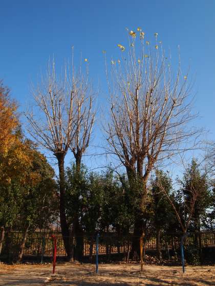 運動場の東南のかどっこのポプラ(?)の木です。先端だけに葉っぱが残りましたが,風に揺れるさまがちょうど「皿回し」の皿のようでとっても面白い動きなんです。