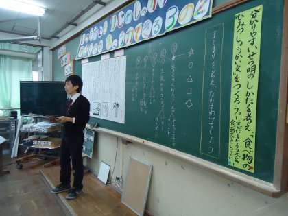 3年2組です。国語の『すがたをかえた大豆』の学習を終え,説明文の構成などを学びました。今度は自分で食品を選んで先生が作った文章を手引きにして,自分たちで書いてみます。