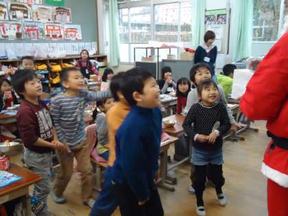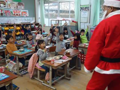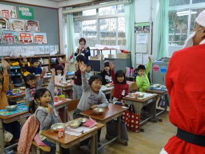 こちらは1年1組です。こちらも大歓迎してくれました。サンタさんが「宿題をしっかりする人やあいさつを頑張る人はケーキをプレゼントしますよ」と言ったところ,みんな「は〜い!」と大きな声で返事をしてくれました。