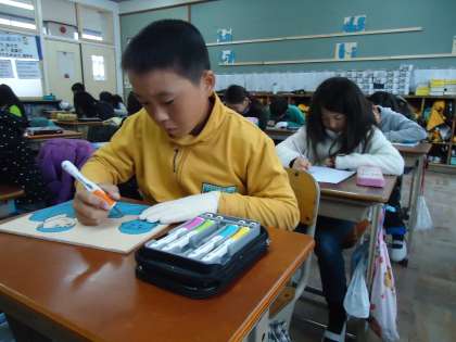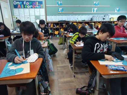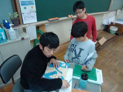 5年2組では木版画をしています。2人以上の人物を組み合わせて面白い構図になるように工夫しながら下絵を描きました。