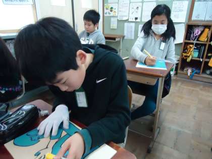 彫っていくには細心の注意が必要です。けが防止のために軍手をはめています。