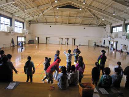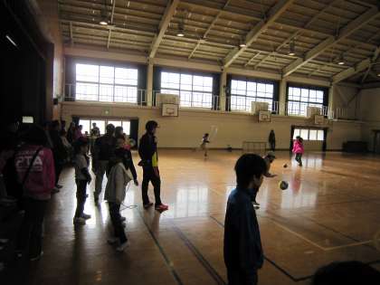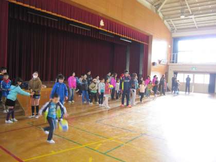 このリレーは,ドリブル・縄跳び・ドリブル・縄跳び・・・・・と交互に繰り返しながらのリレーです。「ぼく,縄跳びが得意やし。縄跳びする。」という子がいて,とっても速かったです。