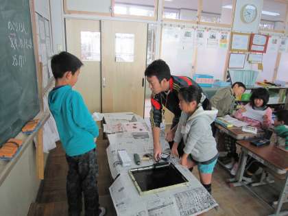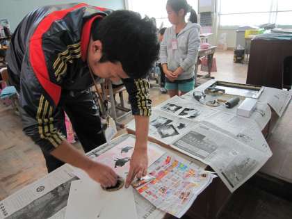 隣りのクラスでは,インクの付け方や刷り方を先生が示していました。