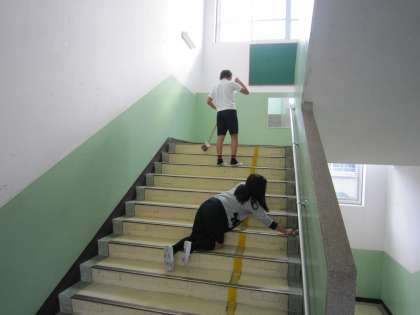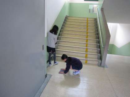 階段をきれいにしようと頑張る子ども達