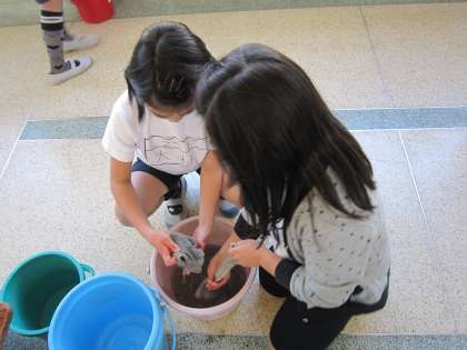 雑巾は,バケツに入れた水で洗うように指導しています。しっかりと守って雑巾を洗っている子がいました。