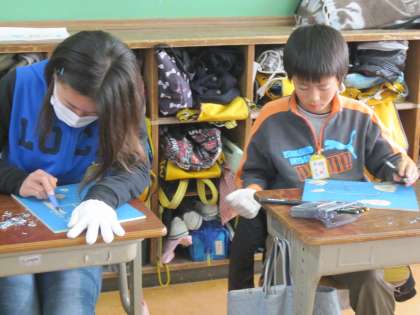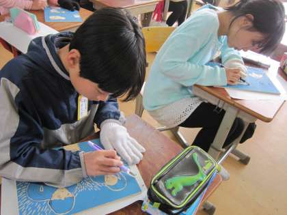 6年1組では,子ども達が懸命に彫り進んでいました。