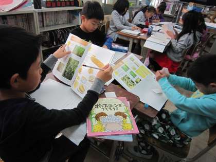 3年1組の子ども達が書いているのを見ると,「すがたをかえる魚」「すがたをかえる麦」「すがたをかえる米」という題名が目に入りました。