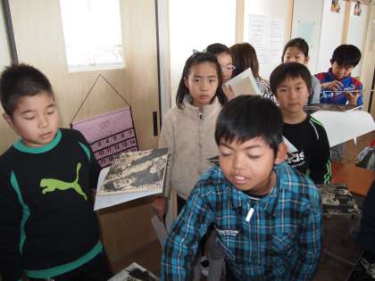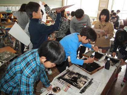 5年1組は版画の摺りでした。
