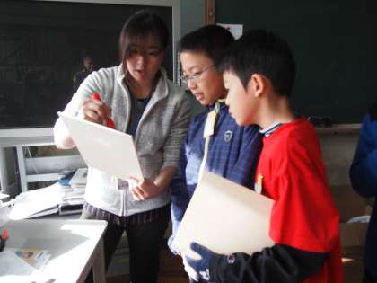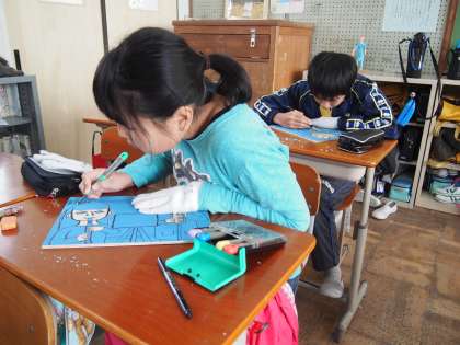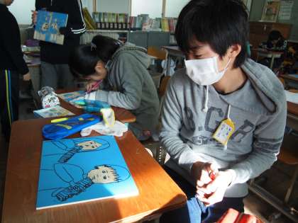 6年2組です。版画の彫り進め方について先生からアドバイスをもらっています。力作ができるといいですね。