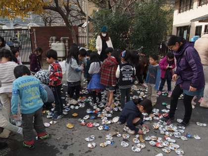 中間休みは1年2組の当番でアルミ缶踏みがありました。保護者の皆様ありがとうございました。