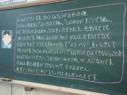 2年1組です。昨日の道徳の校内研究授業で他のクラスの先生達から声をかけてもらったことが黒板に書かれていました。