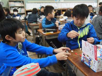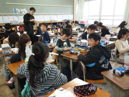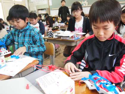 5年1組です。理科の電磁石の学習で子ども達はステップを踏んで,いろんな実験をしてきましたが,今日は最終段階…自動車を組み立てていました。