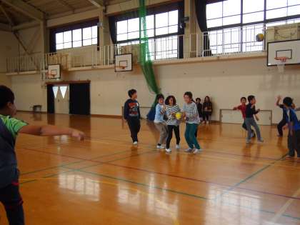 さぁ「王様ドッジボール」が始まりました。前もってどちらのチームも王様を決めておき,相手に気づかれないようにその人をガードしながら相手を当てていきます。誰が王様なのかは先生のみが知っているそうです。