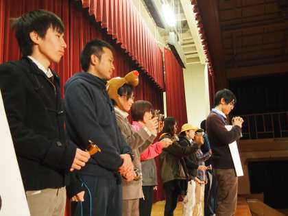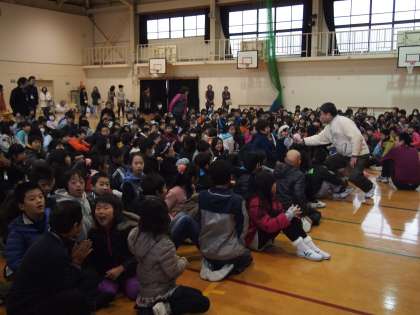 「みなさんにもこのようなことはありませんか?…」主演兼監督の森岡先生がハンドベルの『きよしこの夜』をバックに子ども達に語りかけます。終わった後,会場に感想を聞きました。教室でも担任の先生からお話があったと思います。ぜひみなさんも考えてみて下さい。