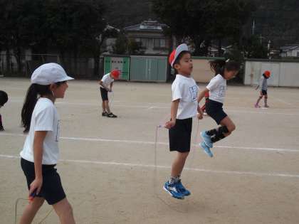 3年2組が縄跳びをしています。できる技にさらに磨きをかけたり,もうちょっと頑張ればできそうな技にトライしたり…寒さに負けずに汗を流しています。