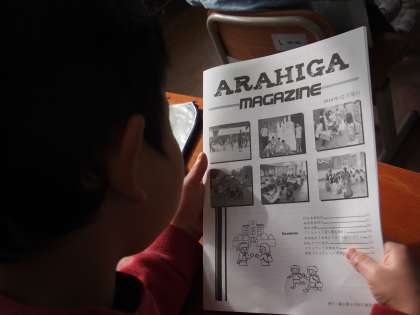 広報委員さんの力作「ARAHIGA MAGAZINE」ができあがりました。子ども達が読んでいます。難しい字が多いけど…読めるかな?