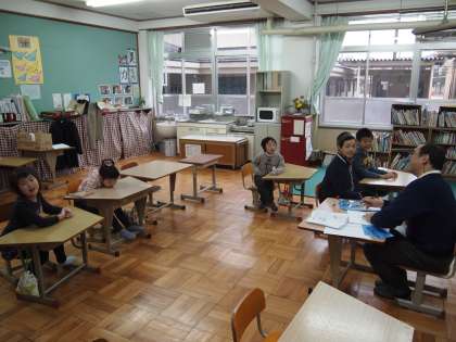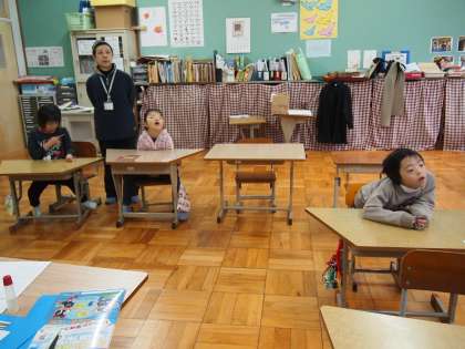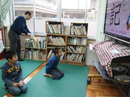 あおぞら学級のはじまりです。おじゃました時はテレビ視聴で漢字の勉強をしていました。今日は日記の「記」でしたね。見終わった後は日直さんのスピーチですが,先日テレビでやっていた『バットマン』のことを楽しそうに話してくれていました。