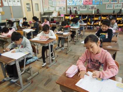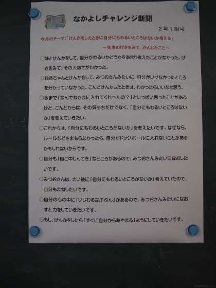 2年1組です。教室の黒板に「なかよしチャレンジ新聞」 2年1組版が貼ってありました。先日の職員劇「けんかをした時に自分にも悪いところはないかを考える」をテーマに学級独自で作られたものでした。子どもたちの感想がいろいろ載っていました。