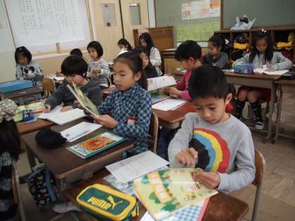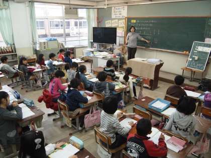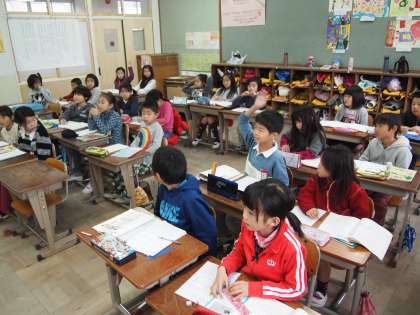 3年1組です。算数の分数の学習で「どちらが大きいかを考える」が今日のめあてです。数直線を活用しながら「なぜそうなのか」を相手に説明できるように練習していました。