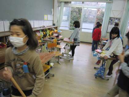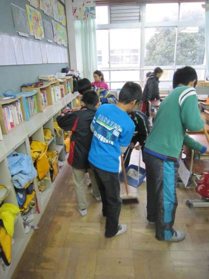 朝からの雨の中,教室掃除をがんばる子ども達がいました。