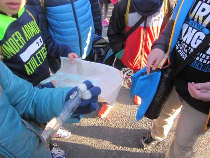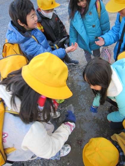 また,学校内の水溜りの水も凍っていて,子ども達が氷に触れて楽しんでいました。