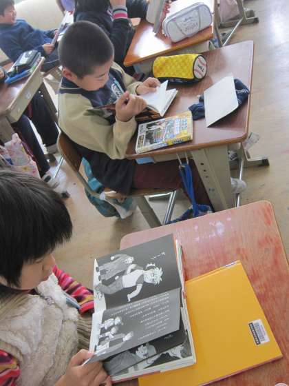 早く借りた子たちは,教室に戻ってさっそく読んでいました。