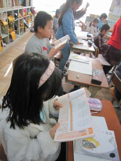 子ども達が立ったり座ったりしながら,音読を繰り返しています。